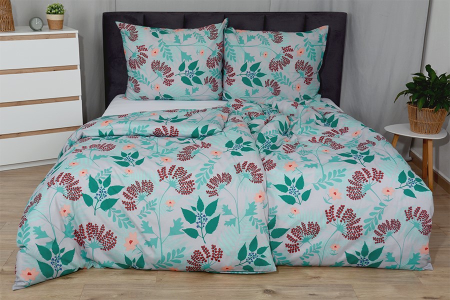 Bavlnené obliečky majú motív lúčnych kvetov, papradí a listov v tónoch tyrkysovej, zelenej, červenej a staroružovej na šedom podklade. Obliečky sú vyrobené z bavlny BASIC, ktorá sa vyznačuje výbornou savosťou a priedušnosťou. Je vhodné na akékoľvek ročné obdobie. Ľahká prímes mikrovlákna prináša mnoho praktických výhod. Zaručuje jemnosť, väčšiu odolnosť proti pokrčeniu a stálefarebnosť materiálu, farby preto zostávajú živé a jasné aj po mnohých praniach. Obliečky majú zapínanie na zips. Svoju posteľ dokonale zladíte, pokiaľ zakúpite froté alebo jersey prestieradlo v rovnakej farbe.