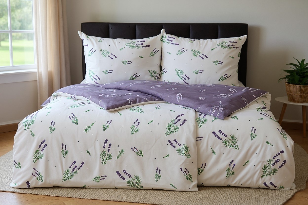Bavlnené obliečky majú obojstranný motív. Jedna strana má krásny motív levanduľou vo fialovej farbe a odtieňoch zelenej na bielom podklade. Druhá strana mákrásny motív levanduľou vo svetlých odtieňoch na fialovom podklade. Obliečky sú vyrobené z bavlny PLUS, ktorá sa vyznačuje výbornou savosťou a priedušnosťou. Je vhodné na akékoľvek ročné obdobie. Ľahká prímes mikrovlákna prináša mnoho praktických výhod. Zaručuje jemnosť, väčšiu odolnosť proti pokrčeniu a stálefarebnosť materiálu, farby preto zostávajú živé a jasné aj po mnohých praniach. Obliečky majú zapínanie na zips. Svoju posteľ dokonale zladíte, pokiaľ zakúpite froté alebo jersey prestieradlo v rovnakej farbe.