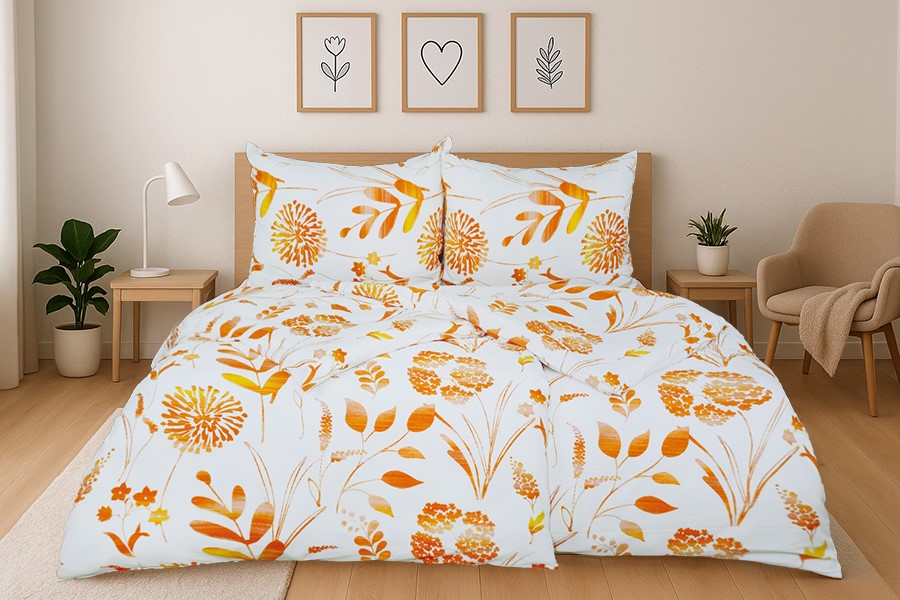 Obliečky MUŠELÍN mikro jemne štruktúrovanej tlače s motívom kvetov a listov v oranžových odtieňoch na bielom podklade. Doprajte si luxusný spánok s našimi obliečkami z mikrovlákna, ktoré na prvý pohľad zaujme svojim autentickým mušelínovým vzhľadom. Jemný a priedušný materiál vám zaistí maximálne pohodlie po celú noc. Jednoduchá údržba a dlhá životnosť sú samozrejmosťou. Hľadáte obliečky, ktoré sú jemné ako mušelín, ale zároveň praktické na údržbu? Naša novinka z mikrovlákna s mušelínovou štruktúrou je ideálnou voľbou. Užite si pocit luxusu a pohodlia každý deň. Mikrovlákno je antibakteriálne a je najlepšou voľbou pre alergikov. Obliečky majú praktické zapínanie na zips. Svoju posteľ môžete dokonale zladiť s jersey prestieradlom z našej ponuky, dostupné je v mnohých odtieňoch.