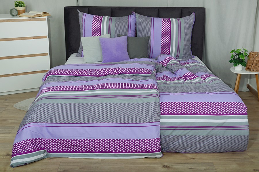Obliečky z mikrovlákna s bavlneným efektom majú motív moderných vodorovných pruhov vo fialovej, bielej a šedej farbe doplnených drobnými geometrickými vzormi. Obliečky sú vyrobené z mikrovlákna, ktoré má špeciálny bavlnený efekt, takže je mäkké, protišmykové, rýchloschnúci, ľahké, a napriek tomu pevné. Je tiež skvelou voľbou pre alergikov, pretože je odolné voči baktériám a roztočom. Obliečky majú praktické zapínanie na zips.