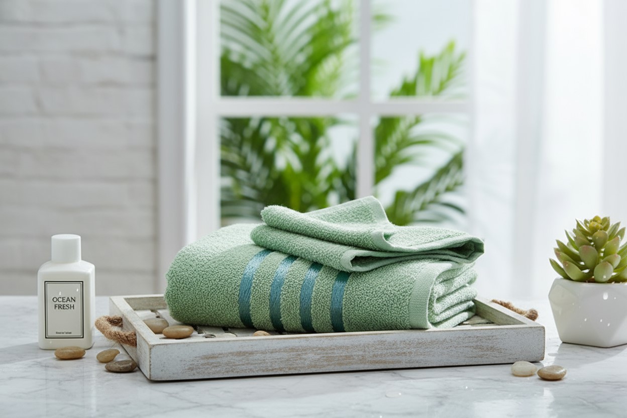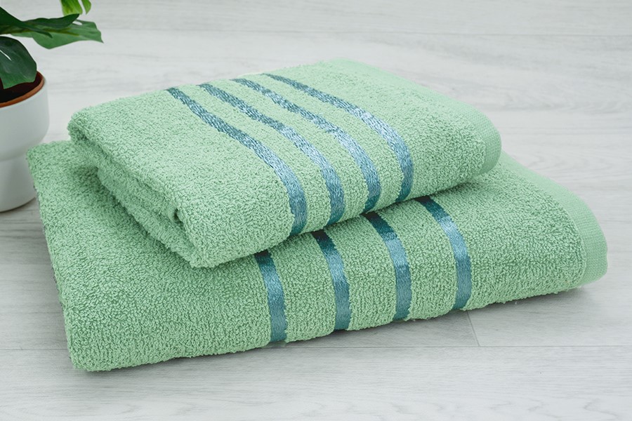 Set uteráka a osušky v zelenej farbe je ozdobená jemnými pruhmi v zelenej farbe. Je vyrobený z bavlny s prímesou polyesteru, ktorá je hebká, príjemná na dotyk a vyniká skvelou savosťou. Vyššia gramáž materiálu je zárukou dlhšej životnosti a odolnosti. Chcete mať vašu kúpeľňu dokonale zladenú? Tak neváhajte vyberať z našej širokej ponuky kúpeľňových predložiek.