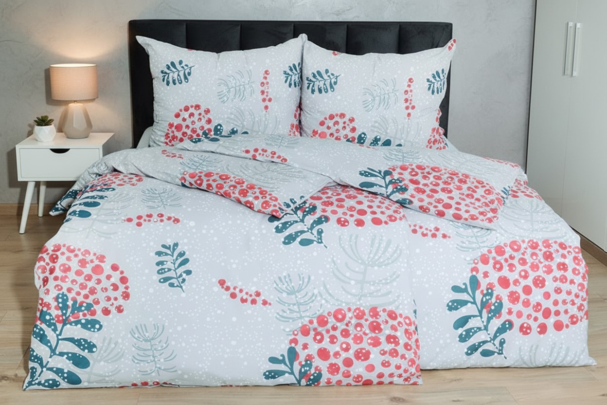 Bavlnené obliečky majú motív rastliniek v šedej a petrolejovej farbe, ktoré dopĺňajú bodky vo farbe malinovej na šedom podklade s padajúcim snehom. Obliečky sú vyrobené z bavlny PLUS, ktorá sa vyznačuje výbornou savosťou a priedušnosťou. Sú vhodné na akékoľvek ročné obdobie. Obliečky majú zapínanie na zips. Svoju posteľ dokonale zladíte, ak zakúpite froté alebo jersey prestieradlo v rovnakej farbe.